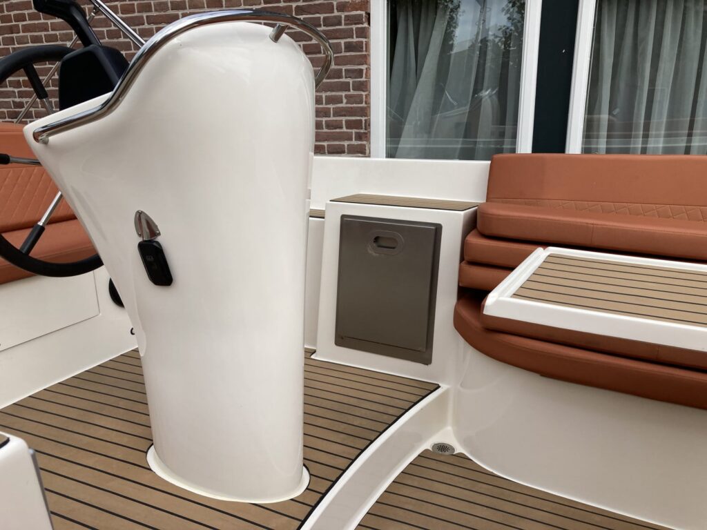 Het eerste wat opvalt aan deze fantastische 7 meter lange tender is het uiterlijk. Kenmerkend voor de Primeur 710 Tender is de gladde buitenzijde zonder kabelaring. Daardoor krijgt deze tender een sportief uiterlijk. Op de neus is een RVS-strip met trekoog bevestigd en ook om het zwemplateau vind je een RVS-stootlijst. Alles klopt aan deze tender. Het zwemplateau heeft een mooie maat en standaard is de boot afgewerkt met een Topdek vloer en Topdek op het zwemplateau.