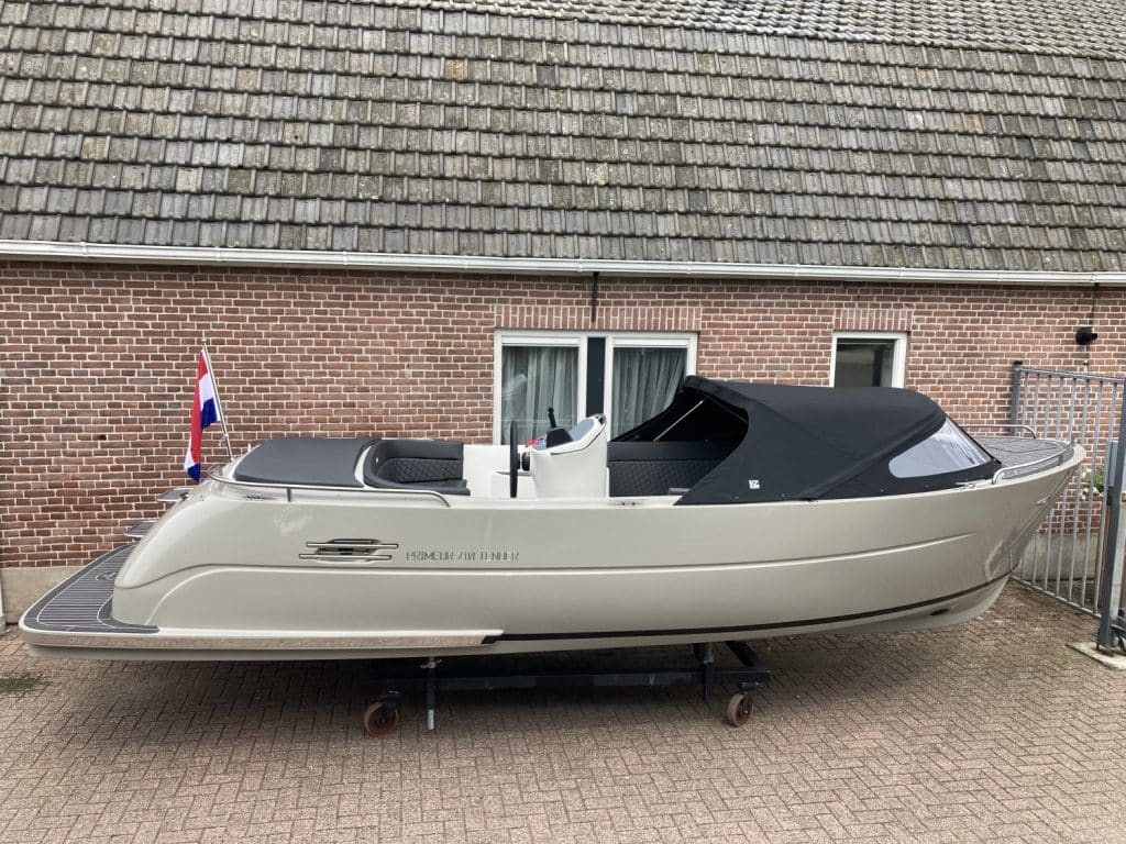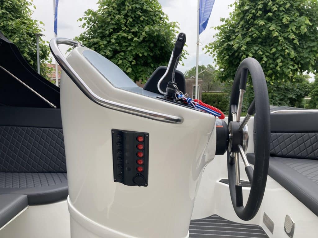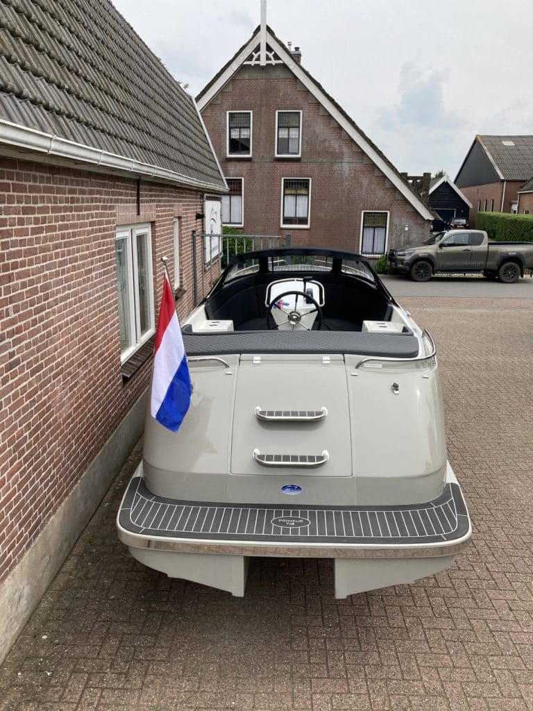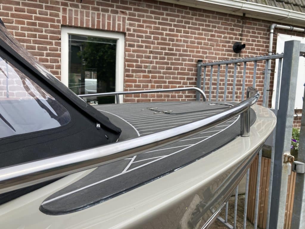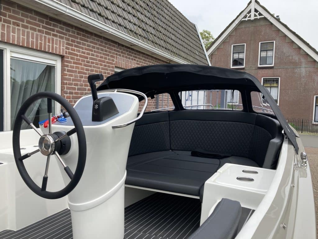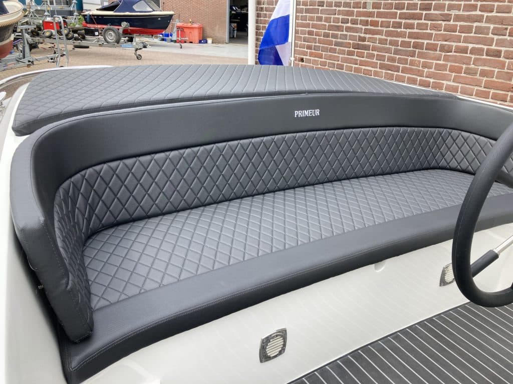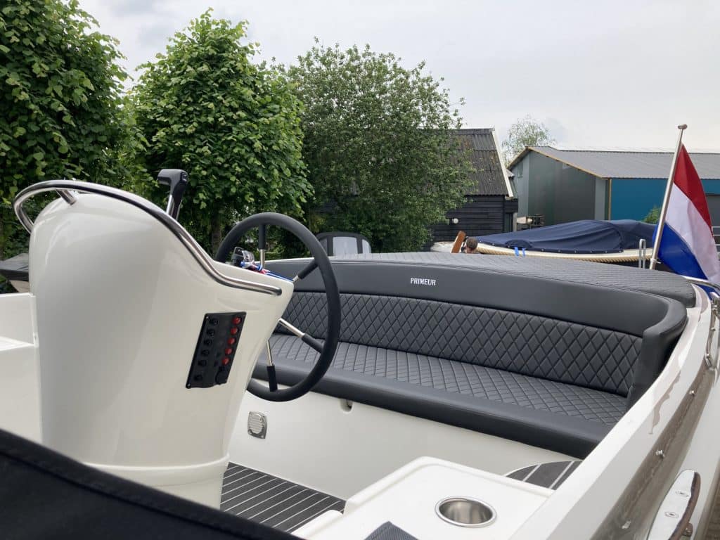 Het eerste wat opvalt aan deze fantastische 7 meter lange tender is het uiterlijk. Kenmerkend voor de Primeur 710 Tender is de gladde buitenzijde zonder kabelaring. Daardoor krijgt deze tender een sportief uiterlijk. Op de neus is een RVS-strip met trekoog bevestigd en ook om het zwemplateau vind je een RVS-stootlijst. Alles klopt aan deze tender. Het zwemplateau heeft een mooie maat en standaard is de boot afgewerkt met een teakline vloer en teakline op het zwemplateau. Optioneel is het mogelijk om het standaard teakline te vervangen voor Finland teakline of zelfs flexiteak. Wat onderhoudsvrij is en niet verkleurt.