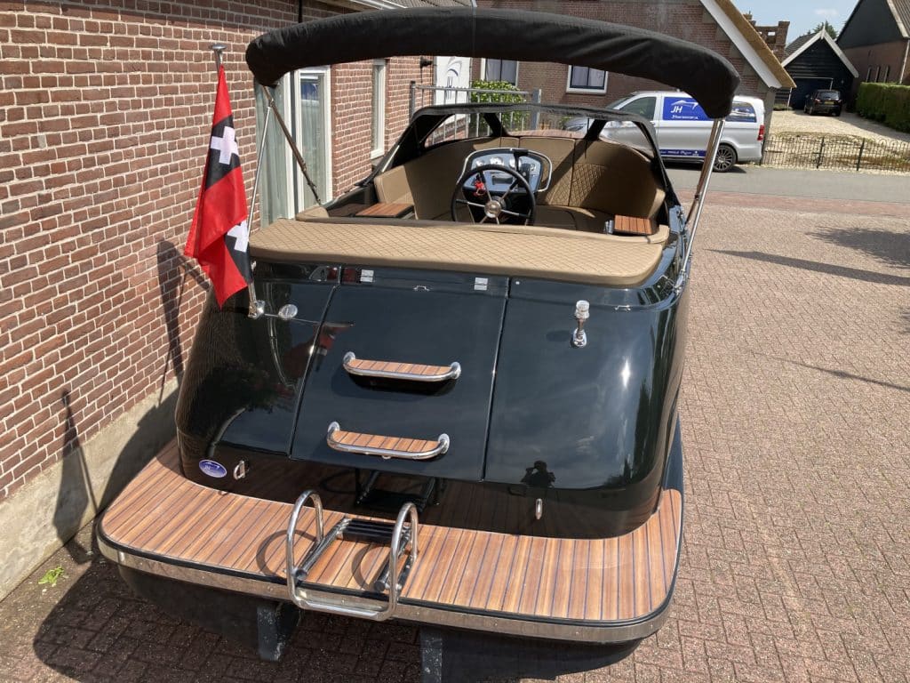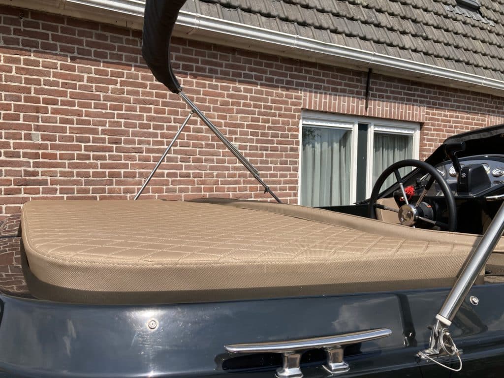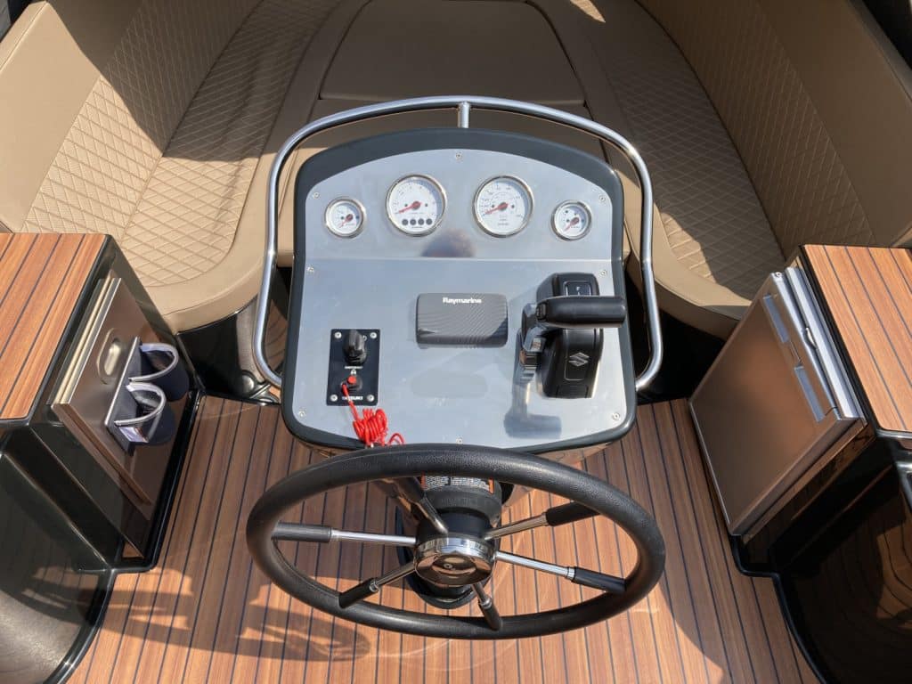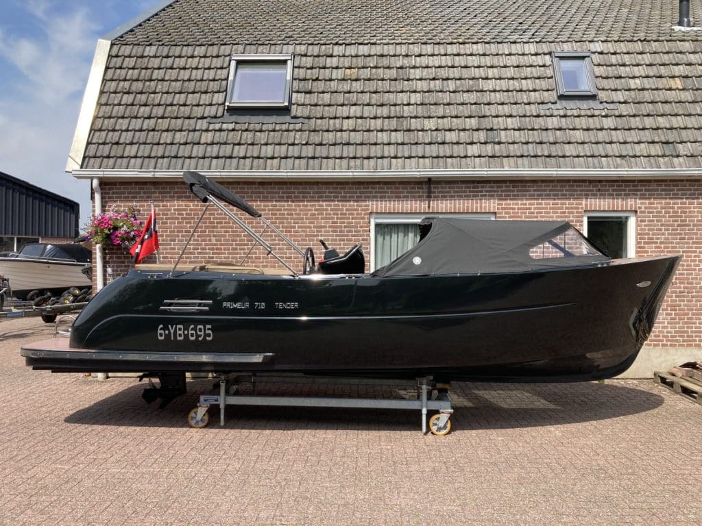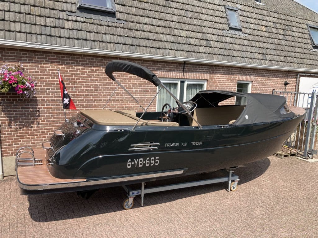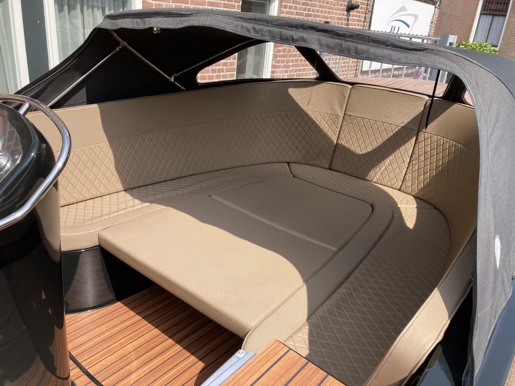 Het eerste wat opvalt is het moderne, strakke uiterlijk zonder kabelaring – typisch voor de Primeur 710. De combinatie van grafietzwarte romp en binnenzijde geeft de boot een chique, sportieve uitstraling. Dankzij het geïntegreerde zwemplateau met teaklook HPL-afwerking is instappen vanaf het water eenvoudig én stijlvol. RVS accenten, zoals het boegoog en de stootlijst, maken het geheel helemaal af.