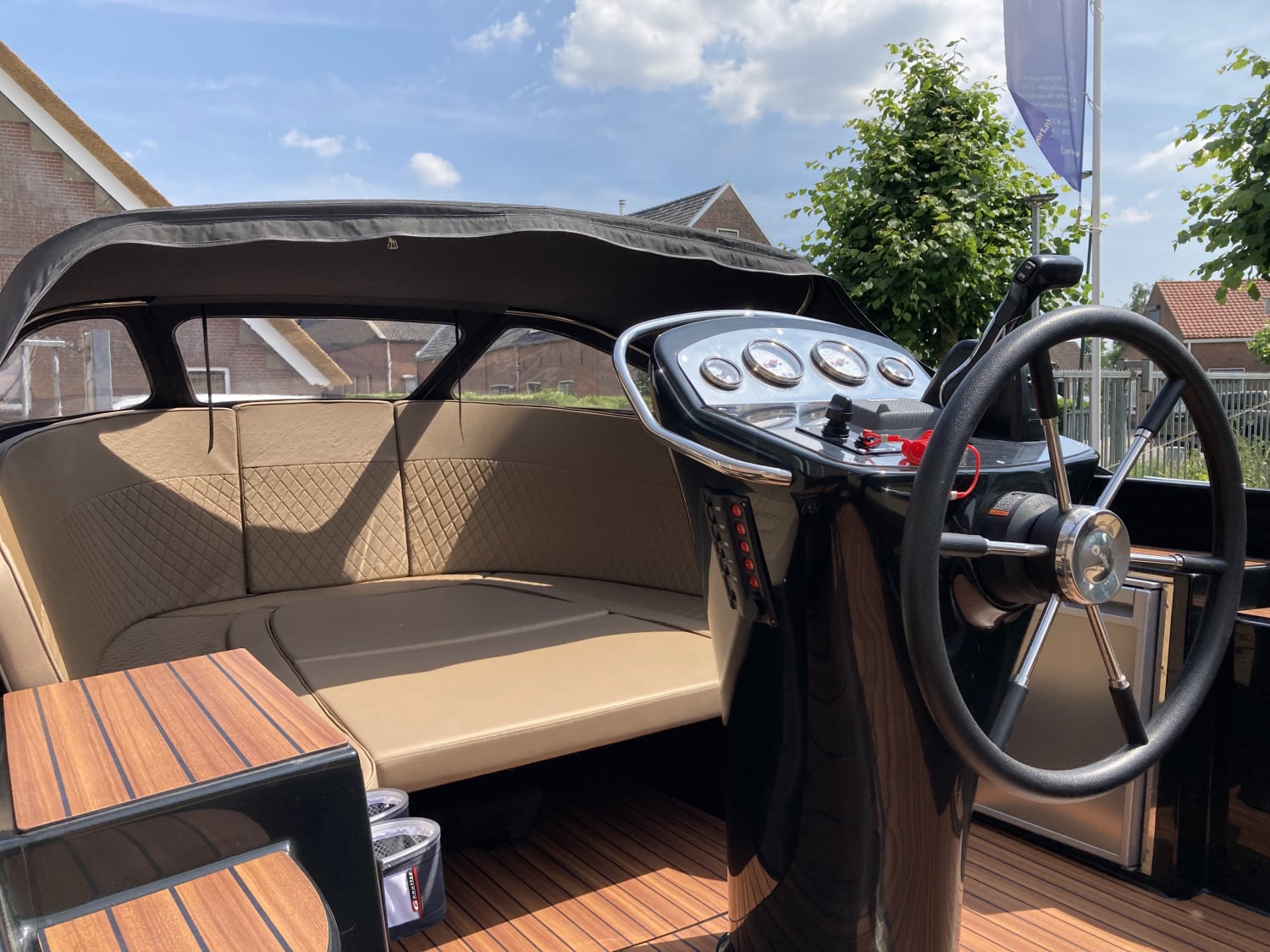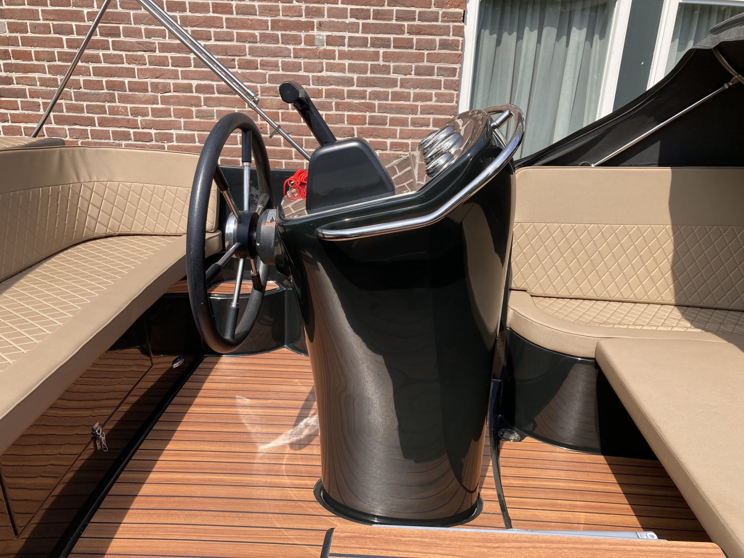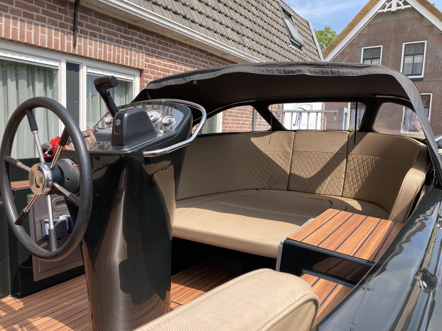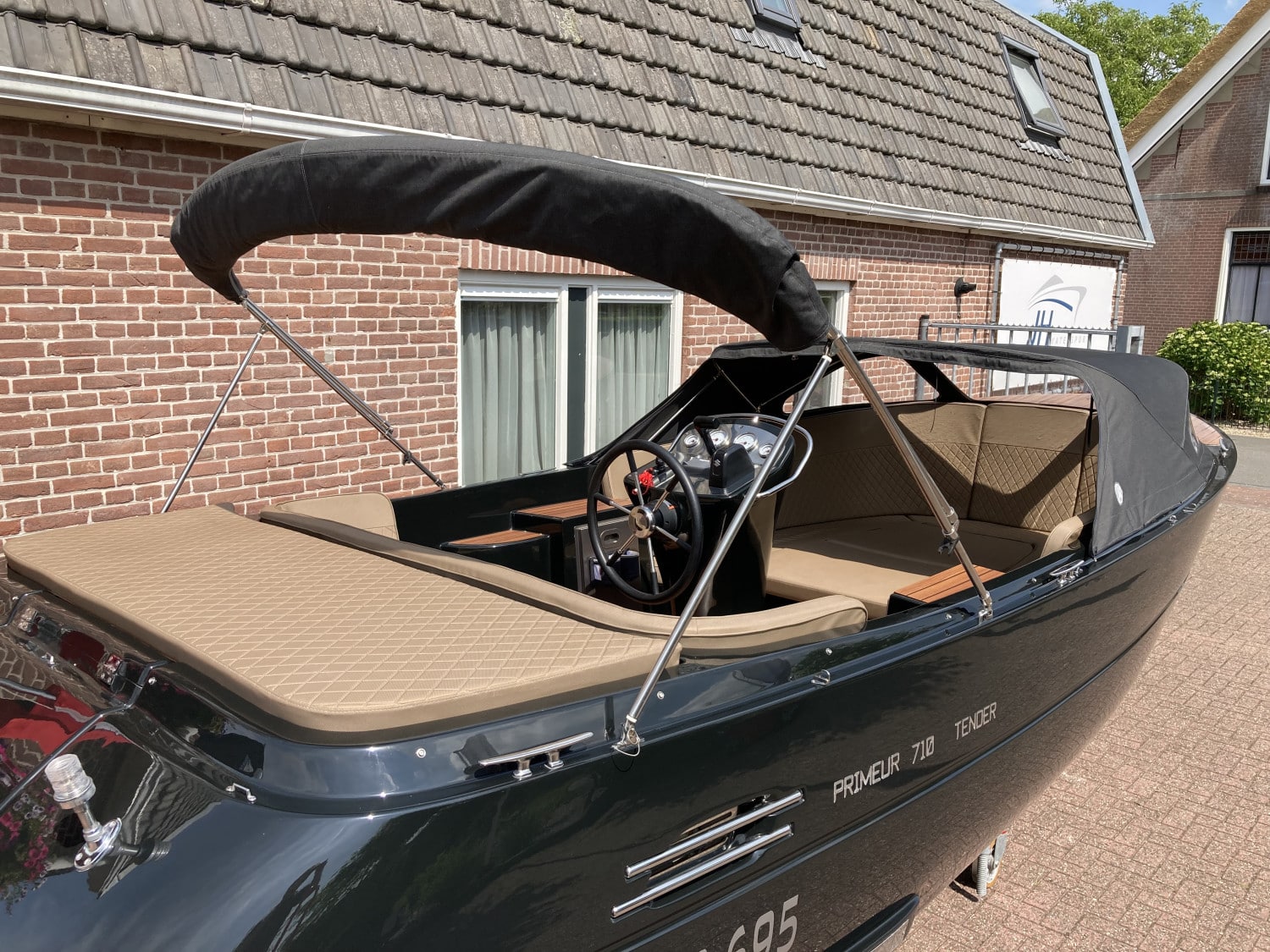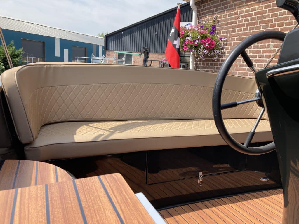 Het eerste wat opvalt is het moderne, strakke uiterlijk zonder kabelaring – typisch voor de Primeur 710. De combinatie van grafietzwarte romp en binnenzijde geeft de boot een chique, sportieve uitstraling. Dankzij het geïntegreerde zwemplateau met teaklook HPL-afwerking is instappen vanaf het water eenvoudig én stijlvol. RVS accenten, zoals het boegoog en de stootlijst, maken het geheel helemaal af.