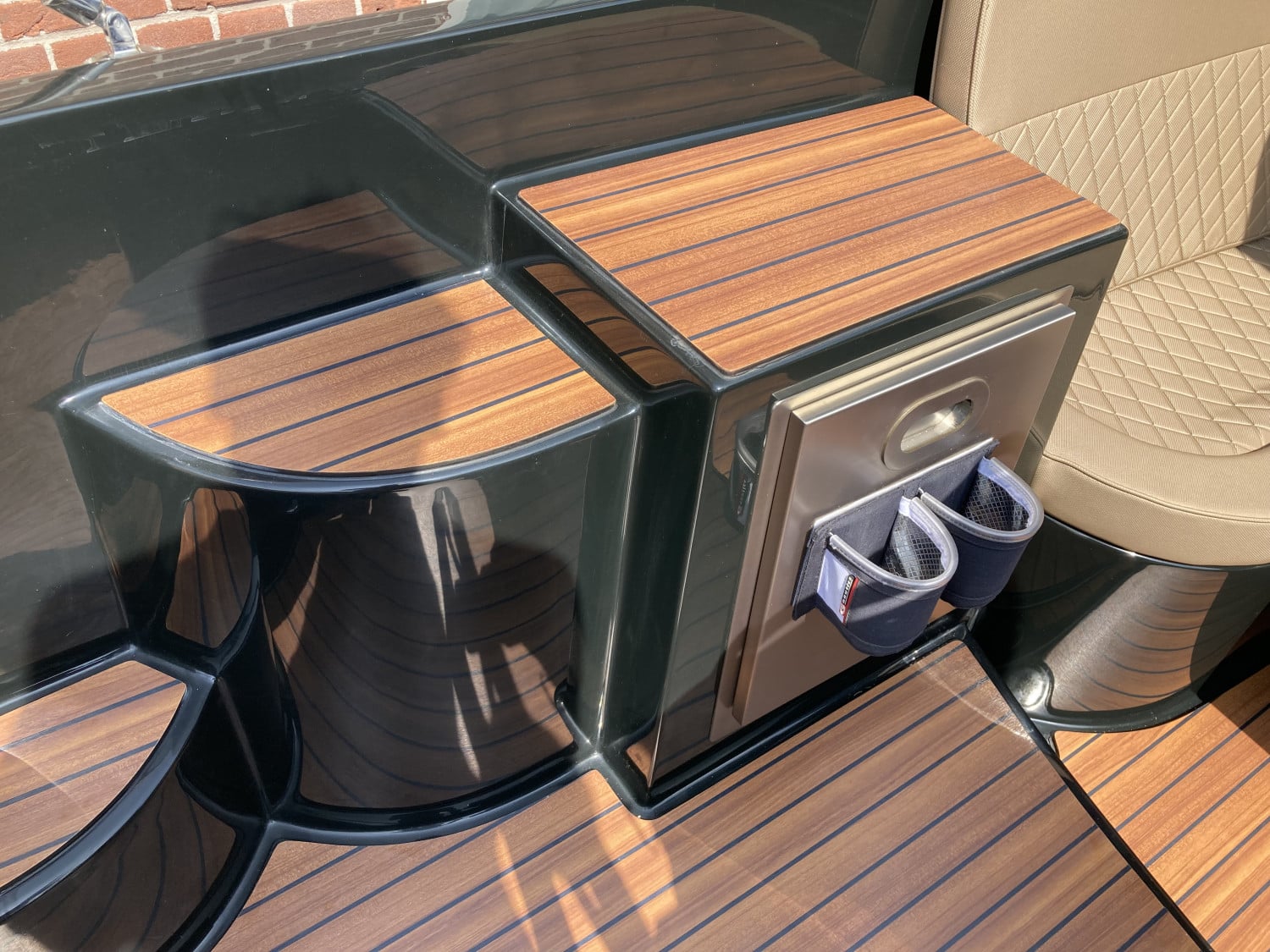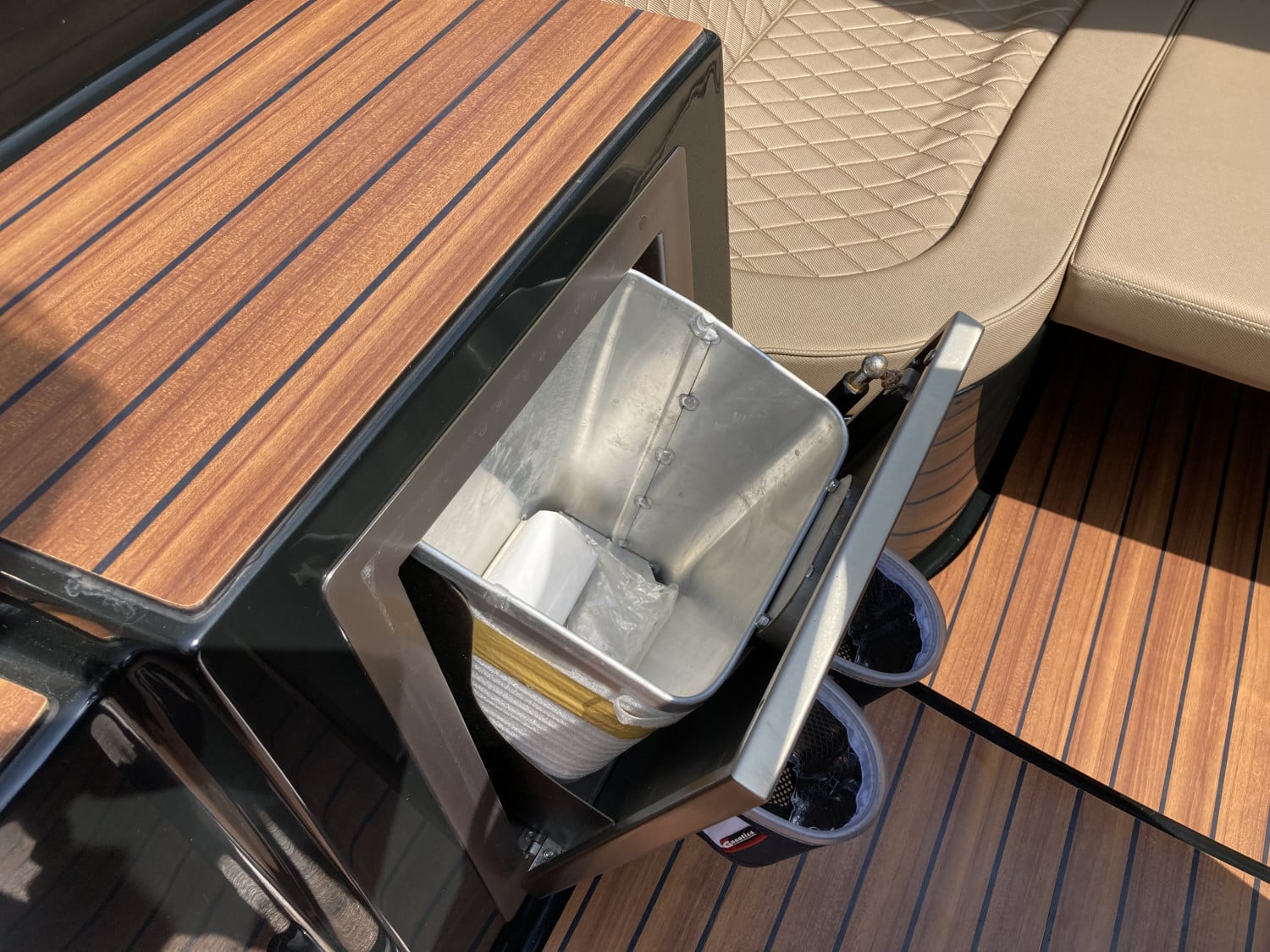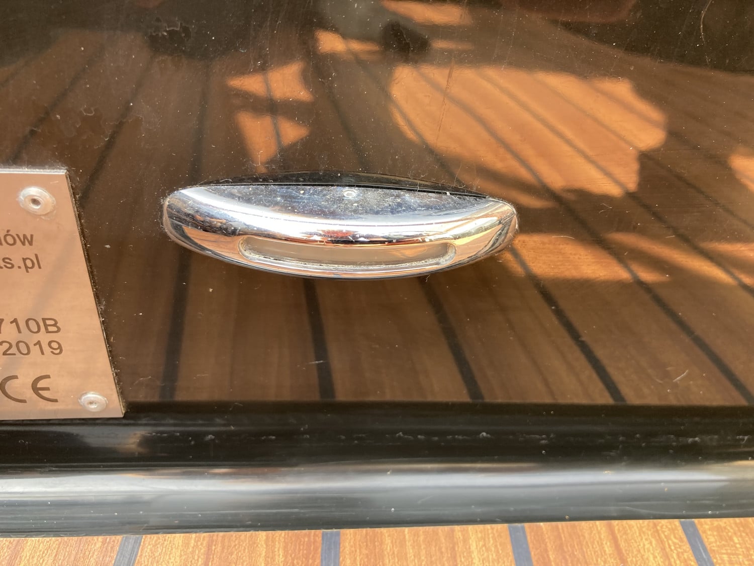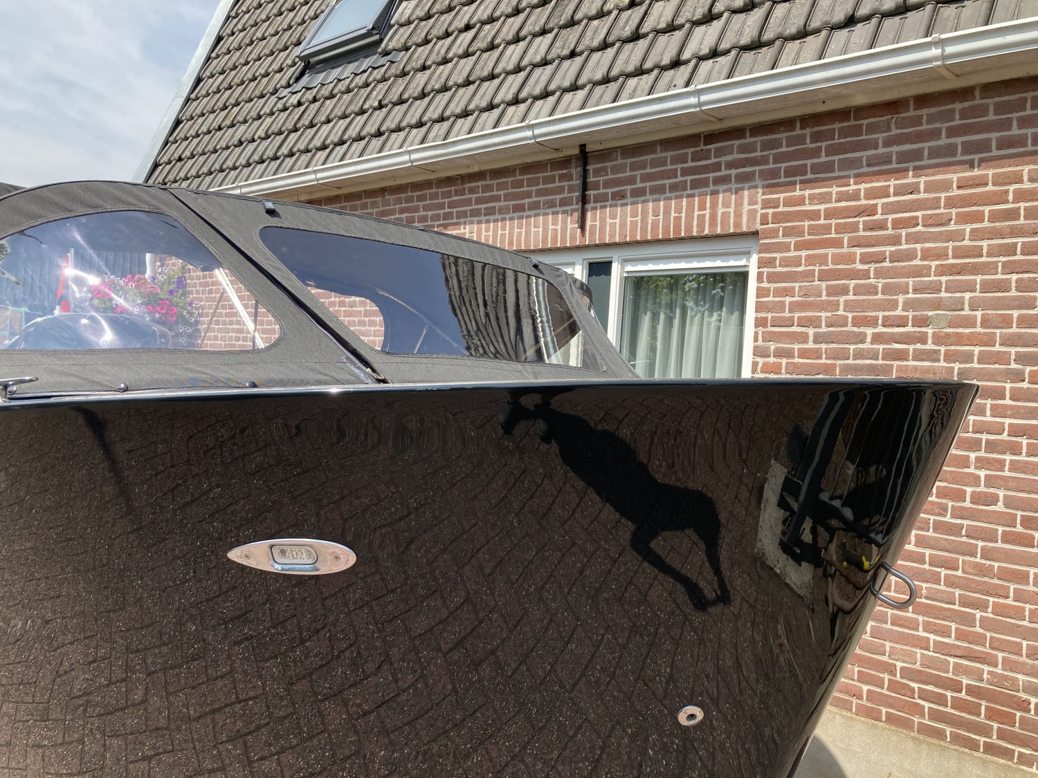 Het eerste wat opvalt is het moderne, strakke uiterlijk zonder kabelaring – typisch voor de Primeur 710. De combinatie van grafietzwarte romp en binnenzijde geeft de boot een chique, sportieve uitstraling. Dankzij het geïntegreerde zwemplateau met teaklook HPL-afwerking is instappen vanaf het water eenvoudig én stijlvol. RVS accenten, zoals het boegoog en de stootlijst, maken het geheel helemaal af.