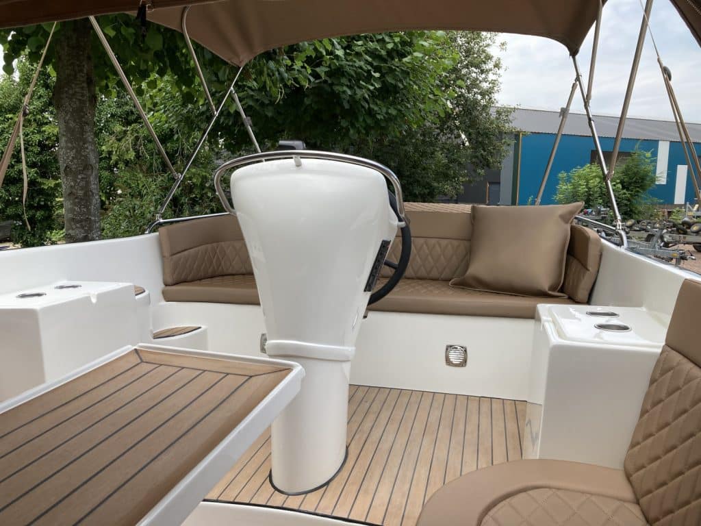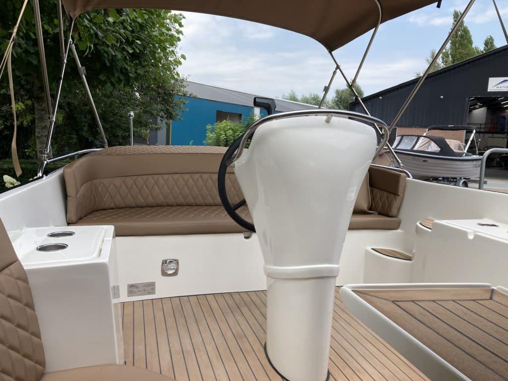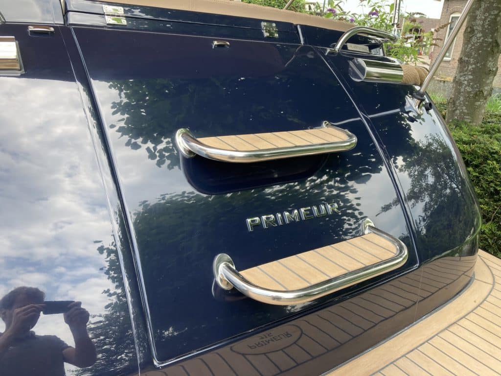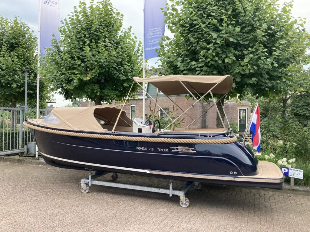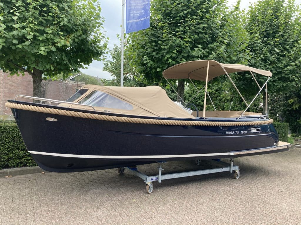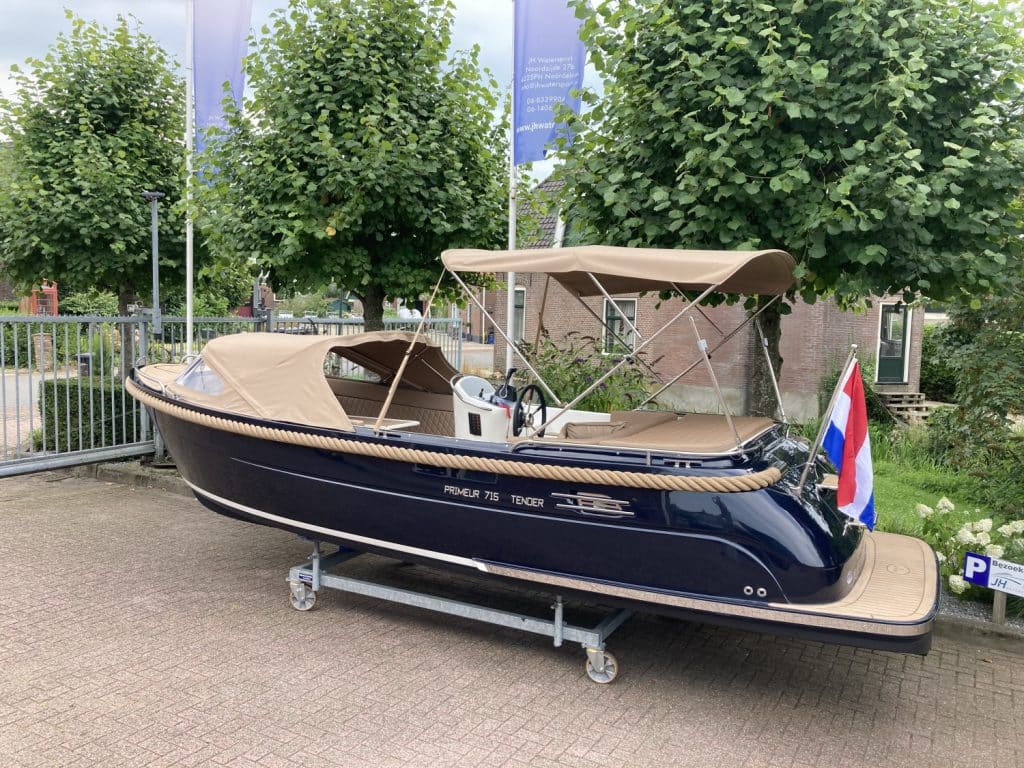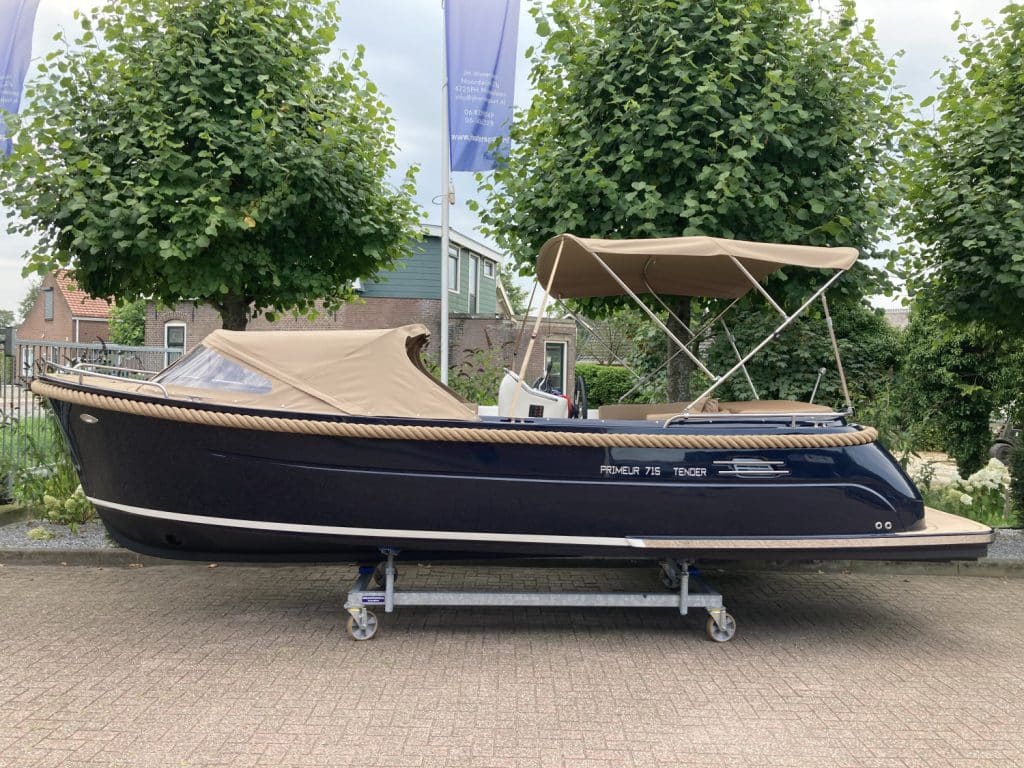Deze mooie ruime Primeur 715 Tender heeft hetzelfde onderwaterschip als de Primeur 710 Tender, maar met andere optische kenmerken. Zo heeft de boot een kabelaring en andere bakken aan de zijkant. Deze bakken zijn te gebruiken als koelkast of prullenbak, maar fungeren ook als extra opbergruimte. Aan de achterkant is een zwemplateau bevestigd, handig om uit het water te komen. Om dit zwemplateau zit een RVS stootlijst. Standaard is de boot uitgevoerd met HPL teakline.