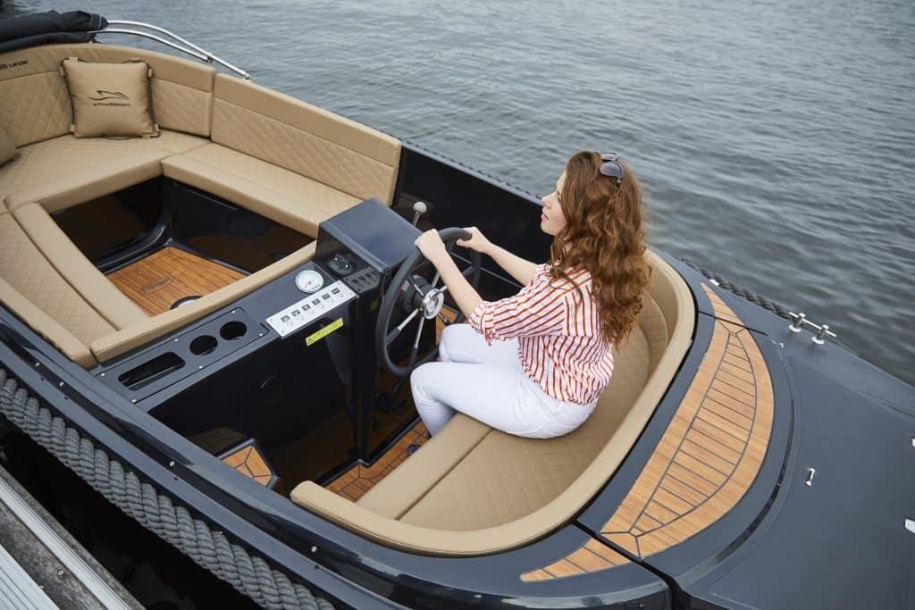 Het vernieuwde model valt direct op door zijn moderne lijnen en luxueuze afwerking. Het gebruik van hoogwaardig teak geeft de boot een warme, klassieke uitstraling die perfect aansluit bij het eigentijdse design. Ook aan het interieur is gedacht: onder de ruime zitbanken bevinden zich praktische opbergvakken, ideaal voor touwen, fenders en persoonlijke spullen.