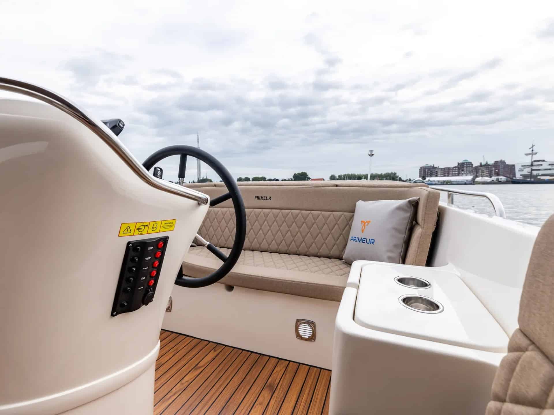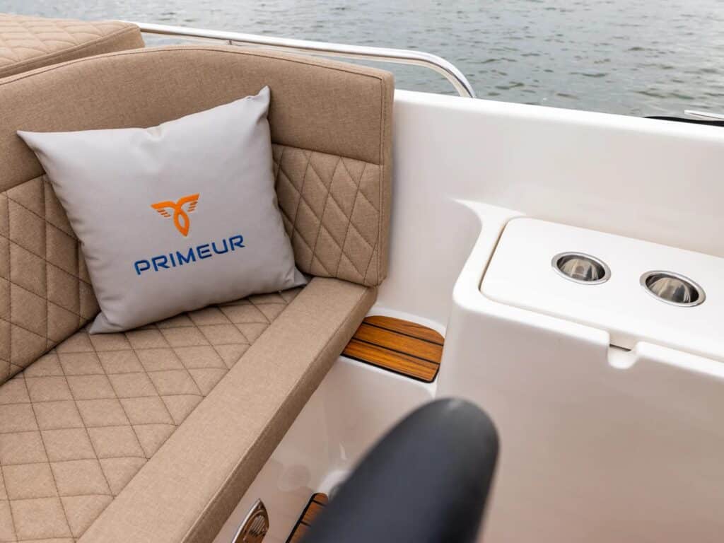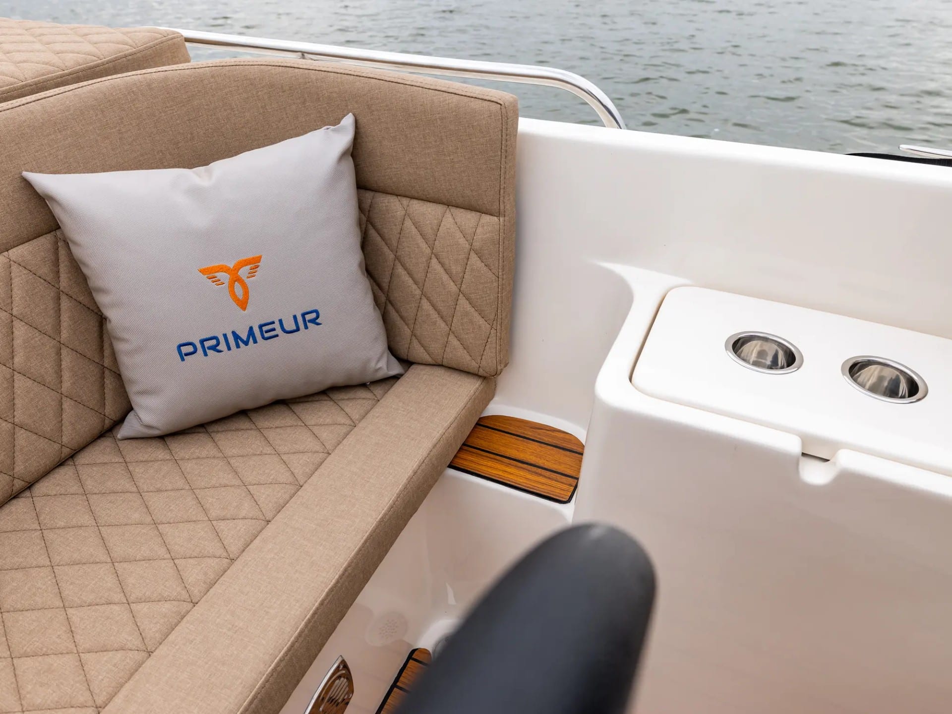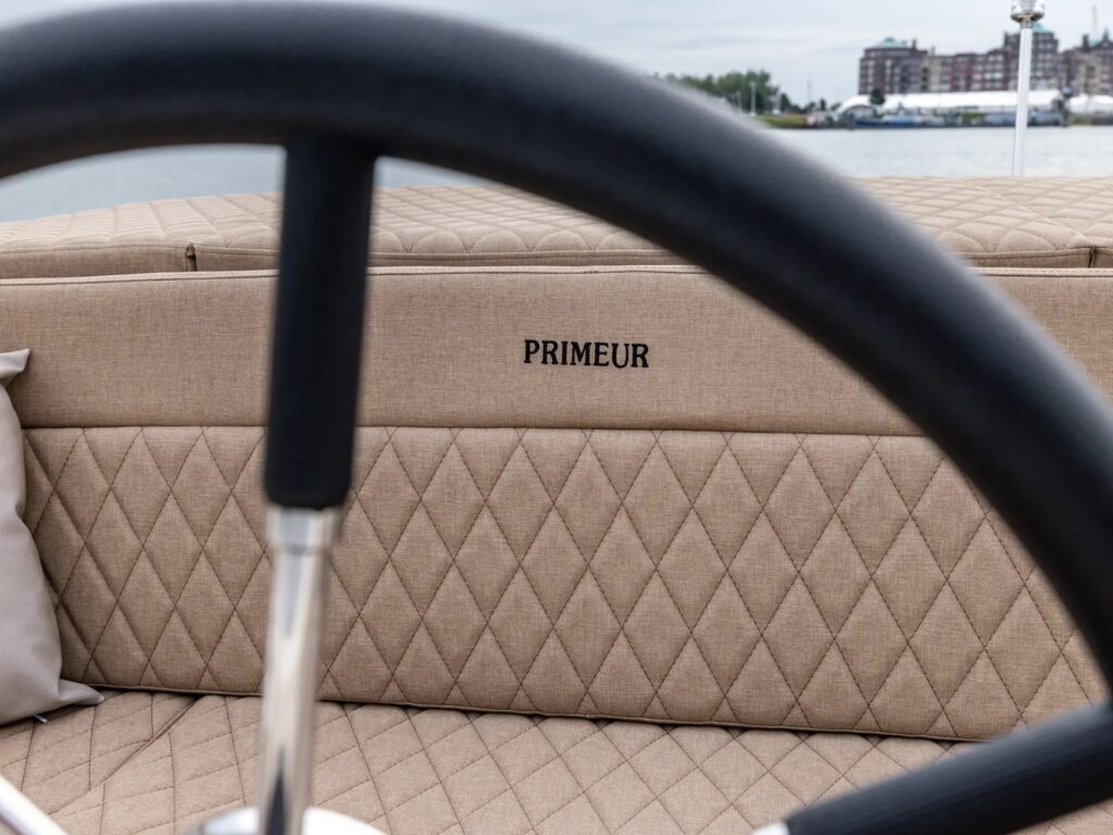 De Primeur 625 Tender is leverbaar in diverse kleurstellingen voor romp en bekleding. Standaard krijgt u de luxe Diamante bekleding, maar u kunt ook kiezen voor de gewatteerde ruiten uitvoering voor extra luxe. De teaklook vloer kan worden geüpgraded naar fin teak of topdeck voor een exclusieve uitstraling.