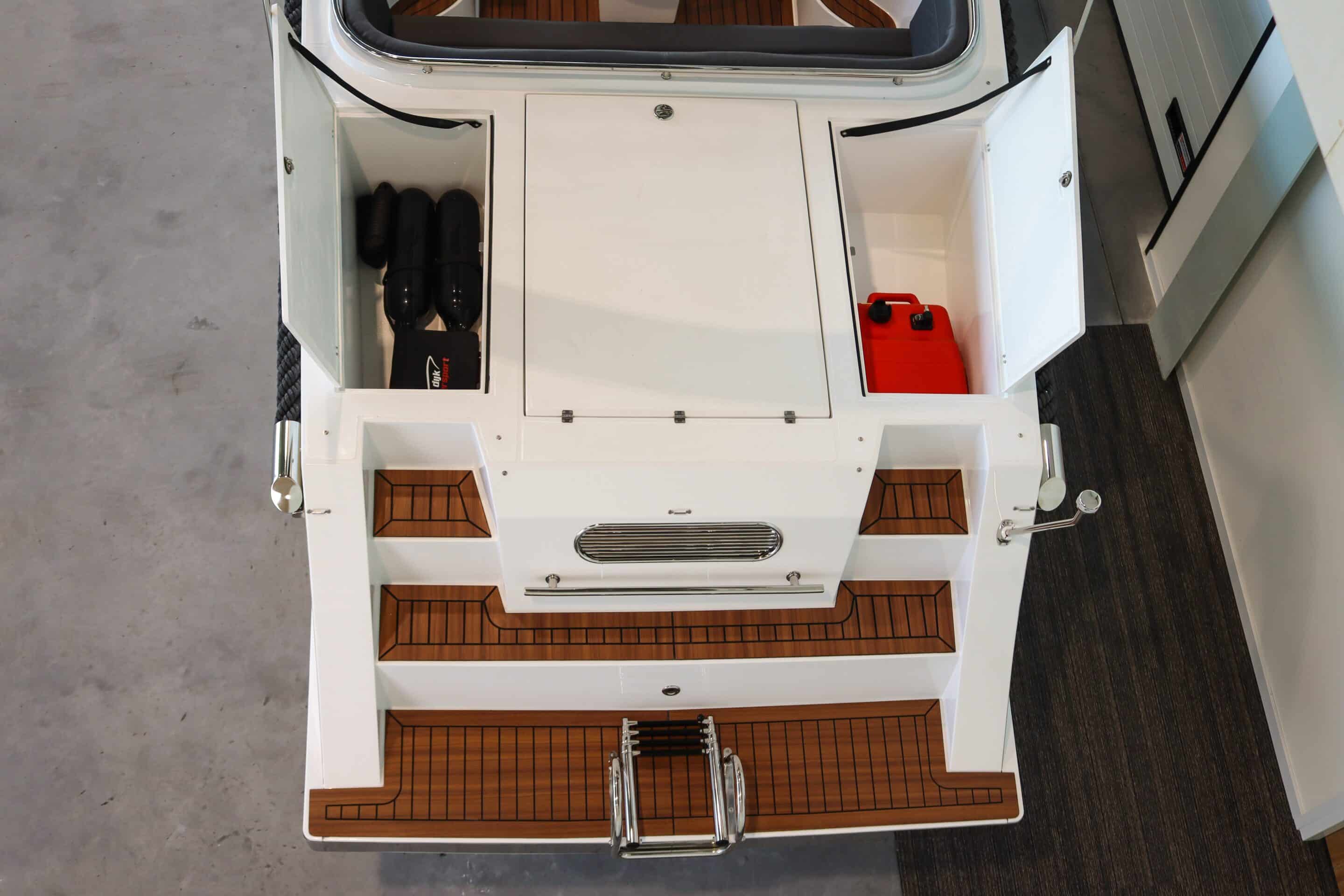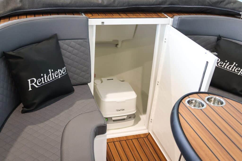Voorin de boot bevindt zich een afgesloten ruimte die standaard gebruikt kan worden als bergruimte, maar ook geschikt is voor het plaatsen van een toilet. Dit maakt de tender ook comfortabel voor langere tochten.
